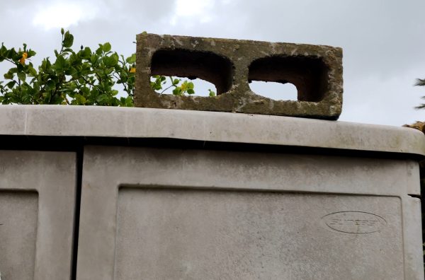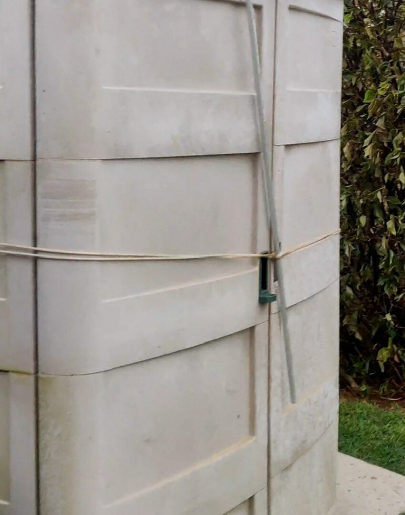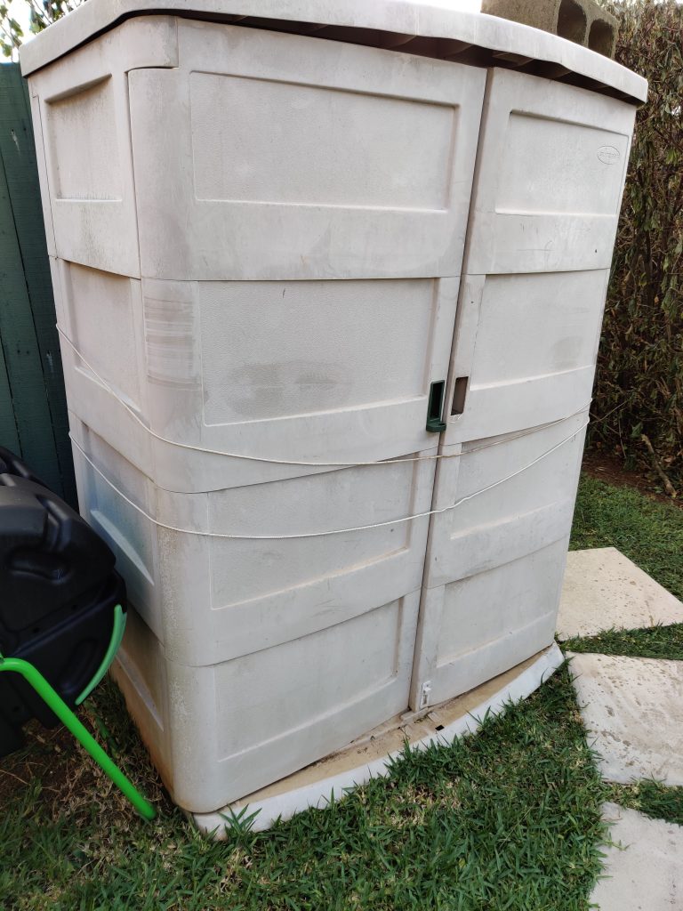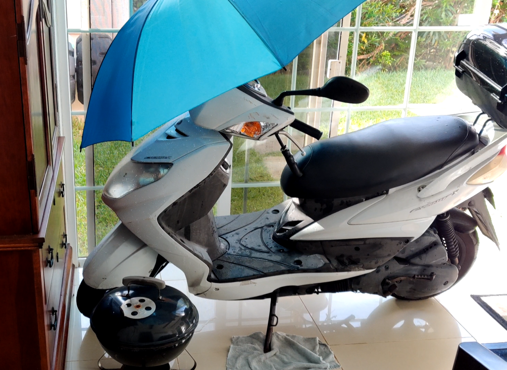 Preparing my place for the storm. I brought in outdoor items like the scooter, BBQ and trash bin, and tied down the shed as best as I could, twisting the ropes tight with rebar. I even put a large brick on top! Last year the shed opened and fell over! So I didn’t want that happening again.