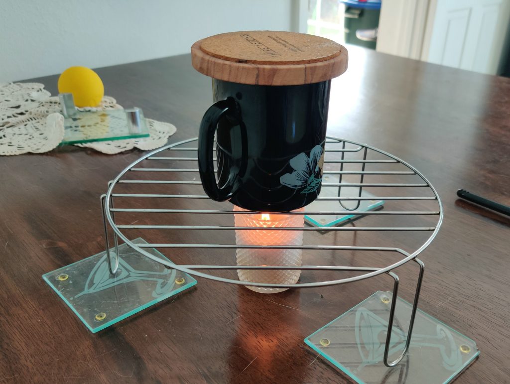 Of coure during the storm, the power always goes. Here’s my little candle-lit dinner, and creative way of warming my morning coffee! š