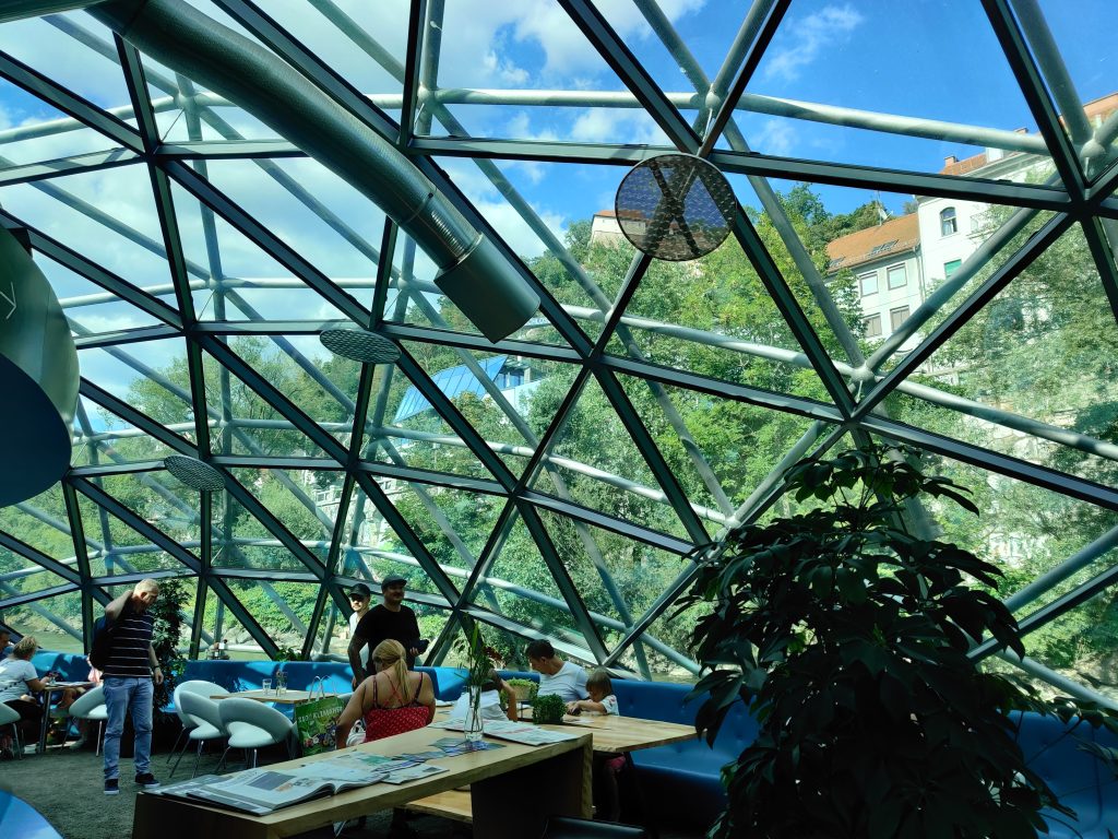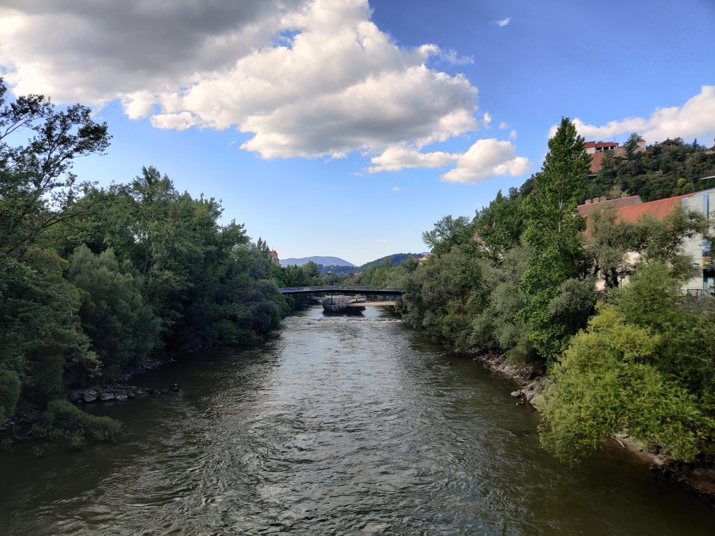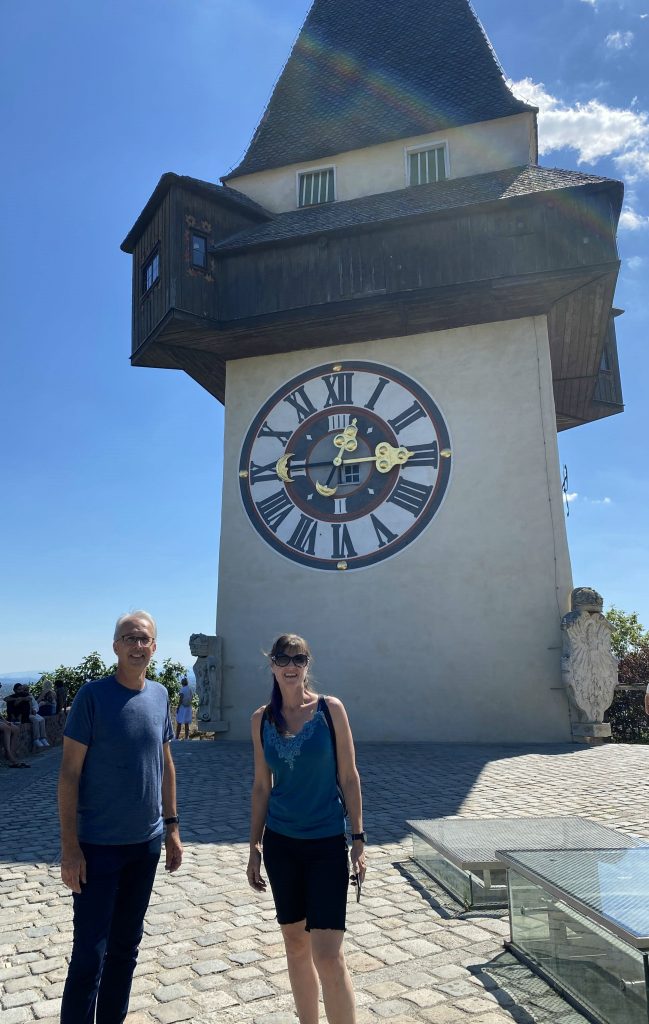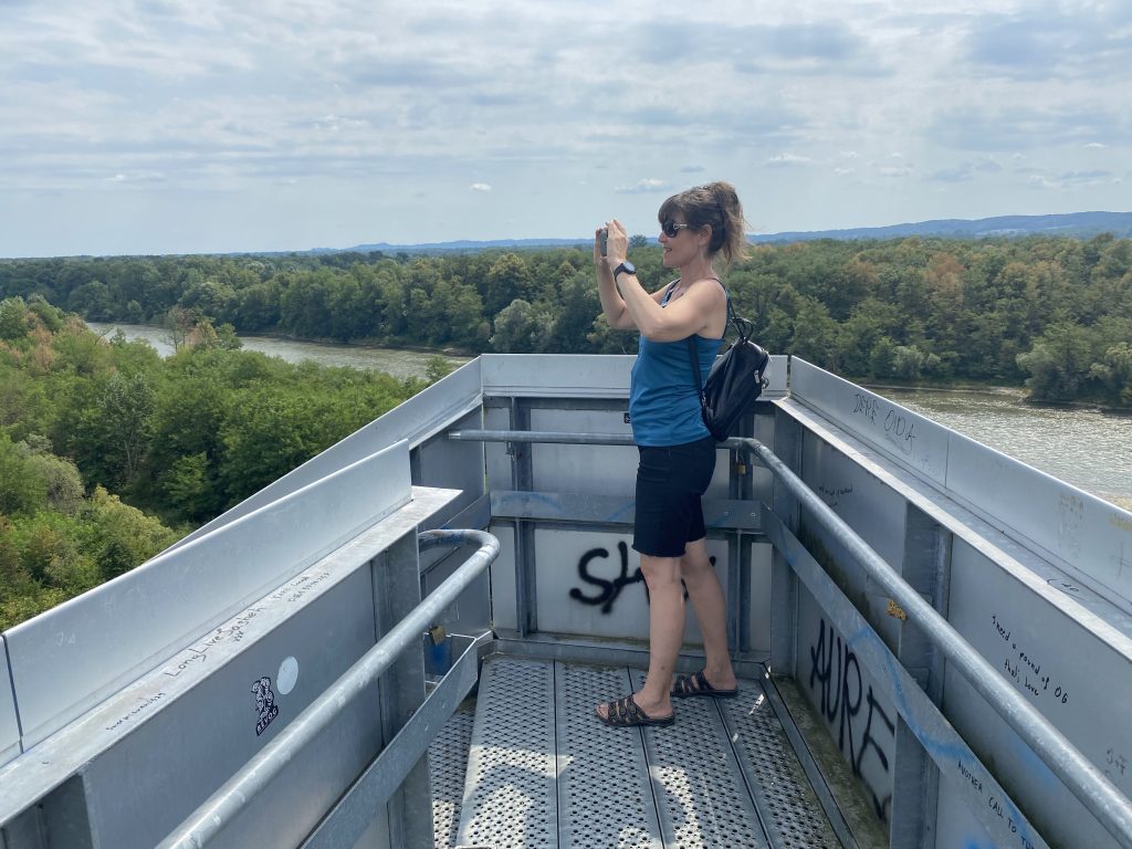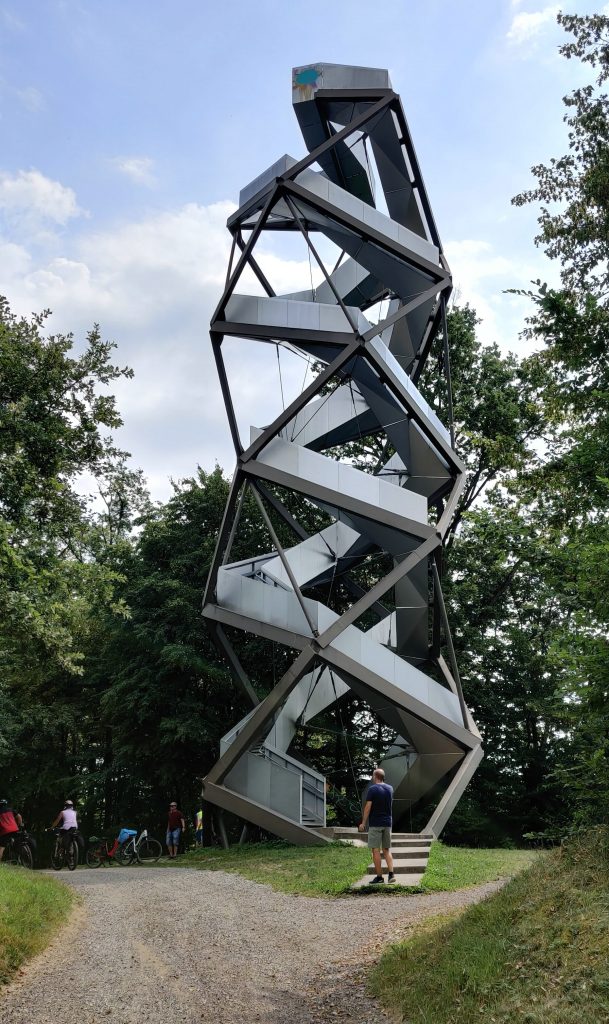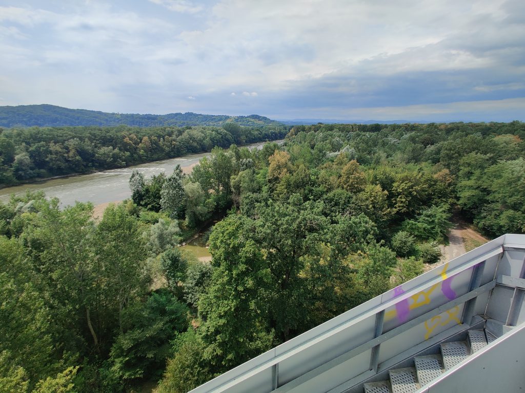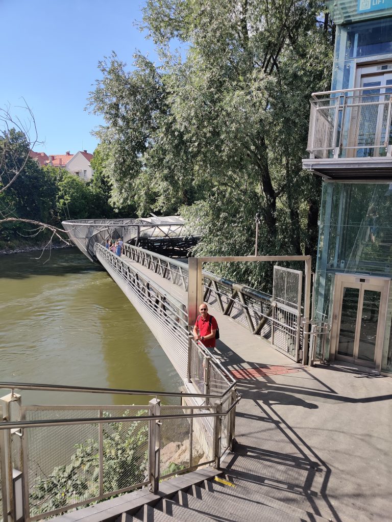 Lothar and I went to the Mur river and tower. The Mur river runs through a lot of places around where we’re staying. The tower has a cool design, and we enjoyed a nice walk, climb, and views!