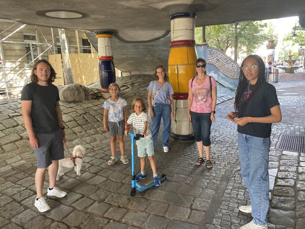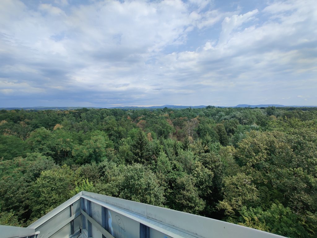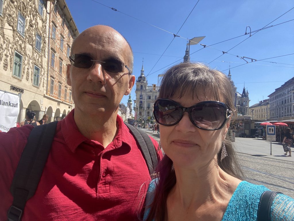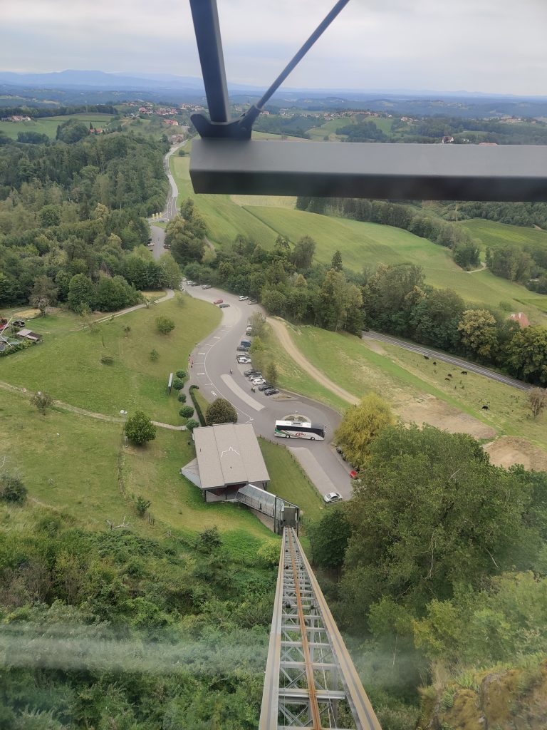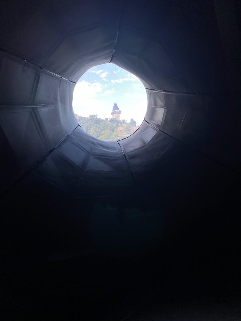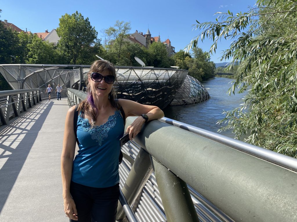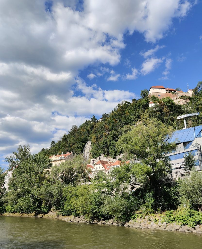 Lothar and I went to the Mur river and tower. The Mur river runs through a lot of places around where we’re staying. The tower has a cool design, and we enjoyed a nice walk, climb, and views!