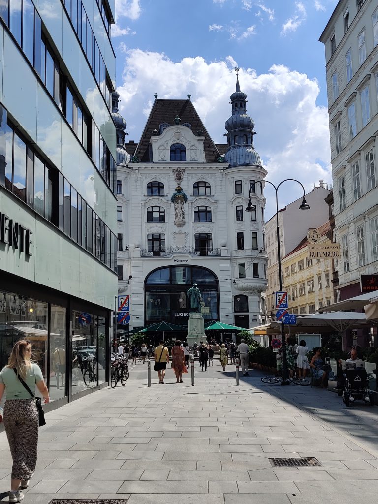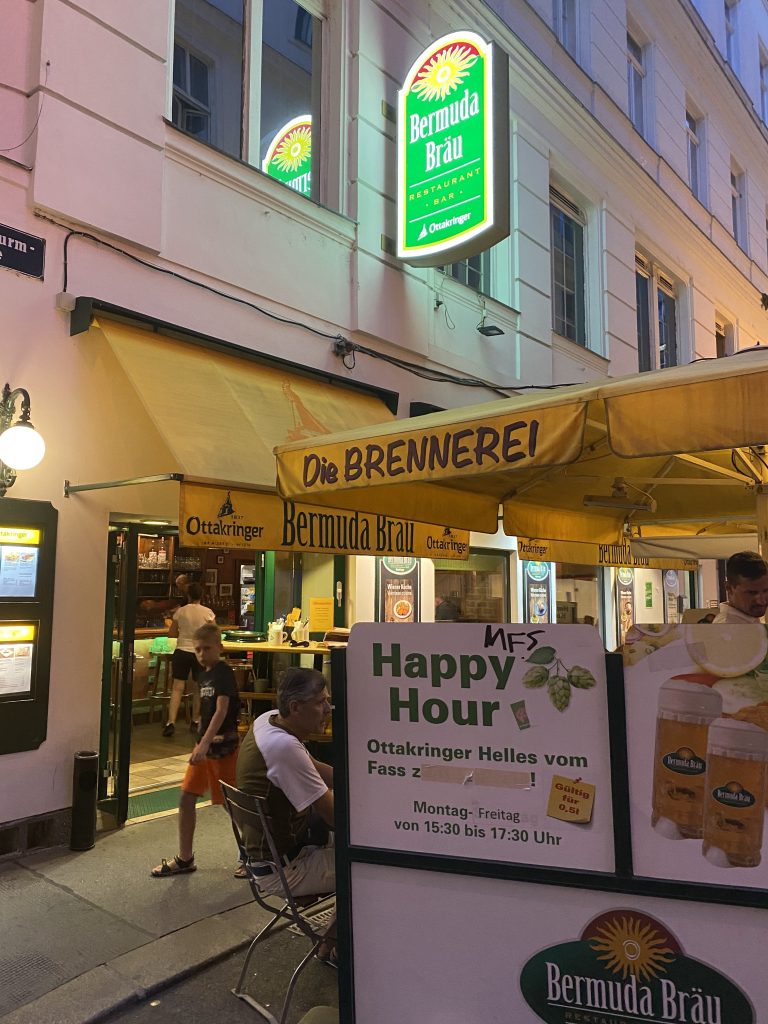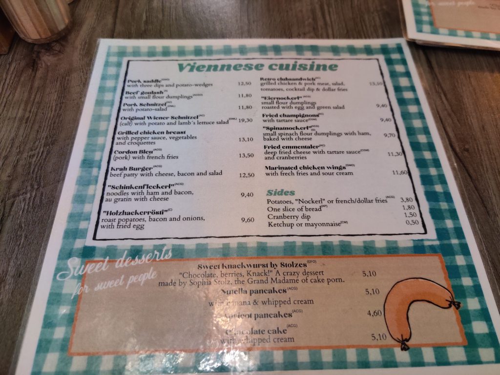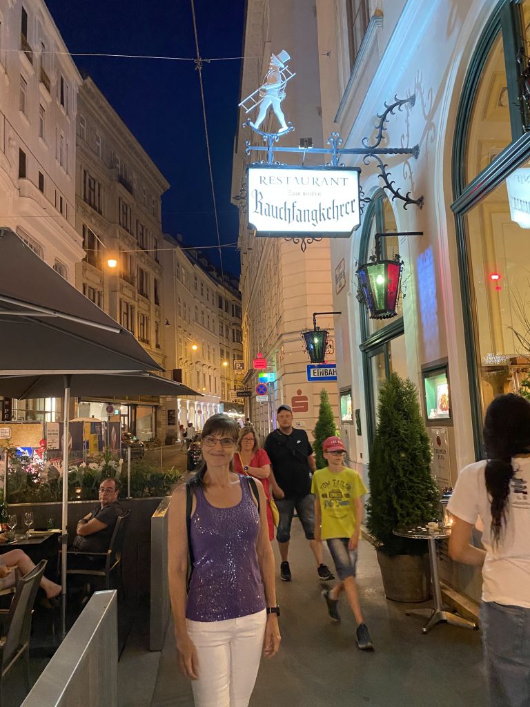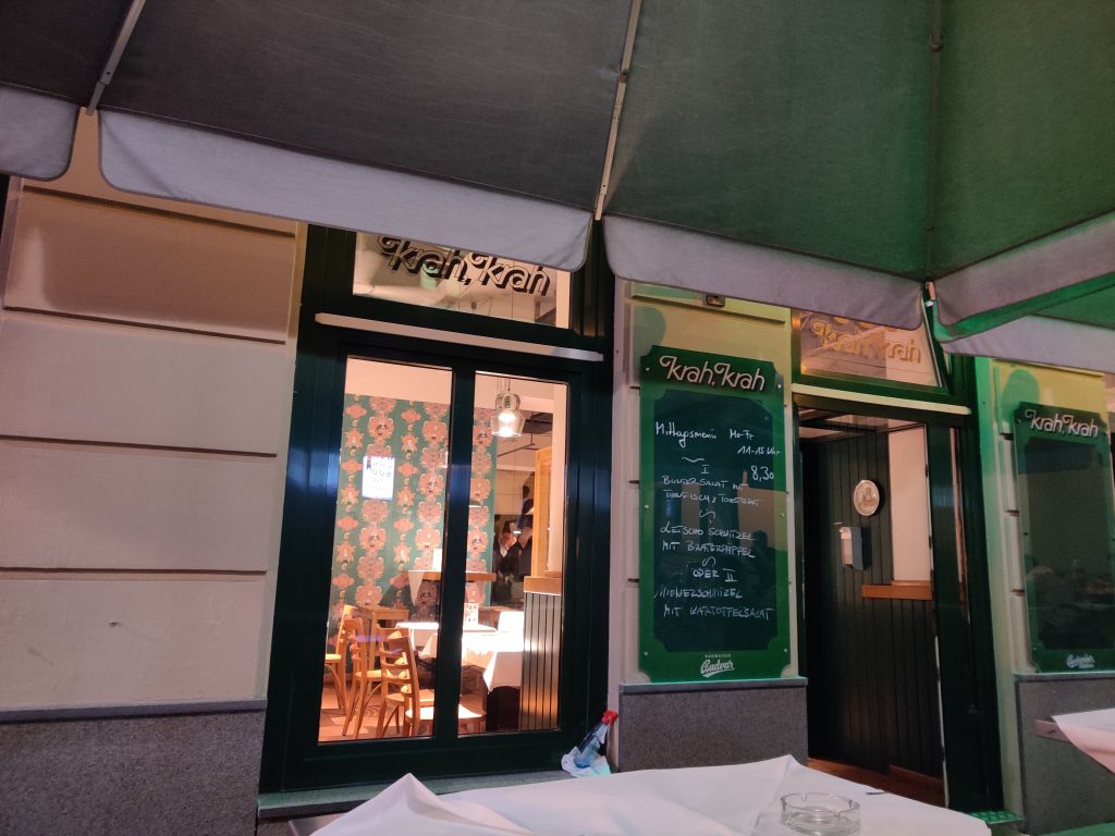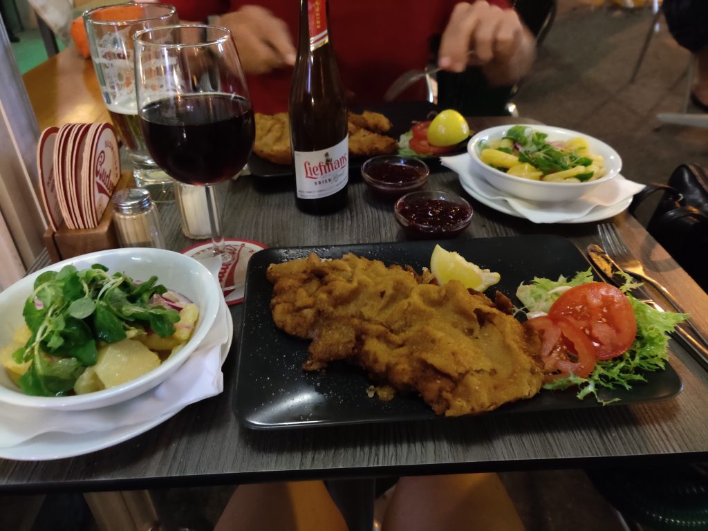 Later in the evening, we walked through Vienna, and ended in the Bermuda Triangle (!!) district at “Krah, Krah” restaurant, where we enjoyed a lovely street atmosphere and amazing Schnitzel! Finally!! Oh and of course Austrian potato salad. Yummm!