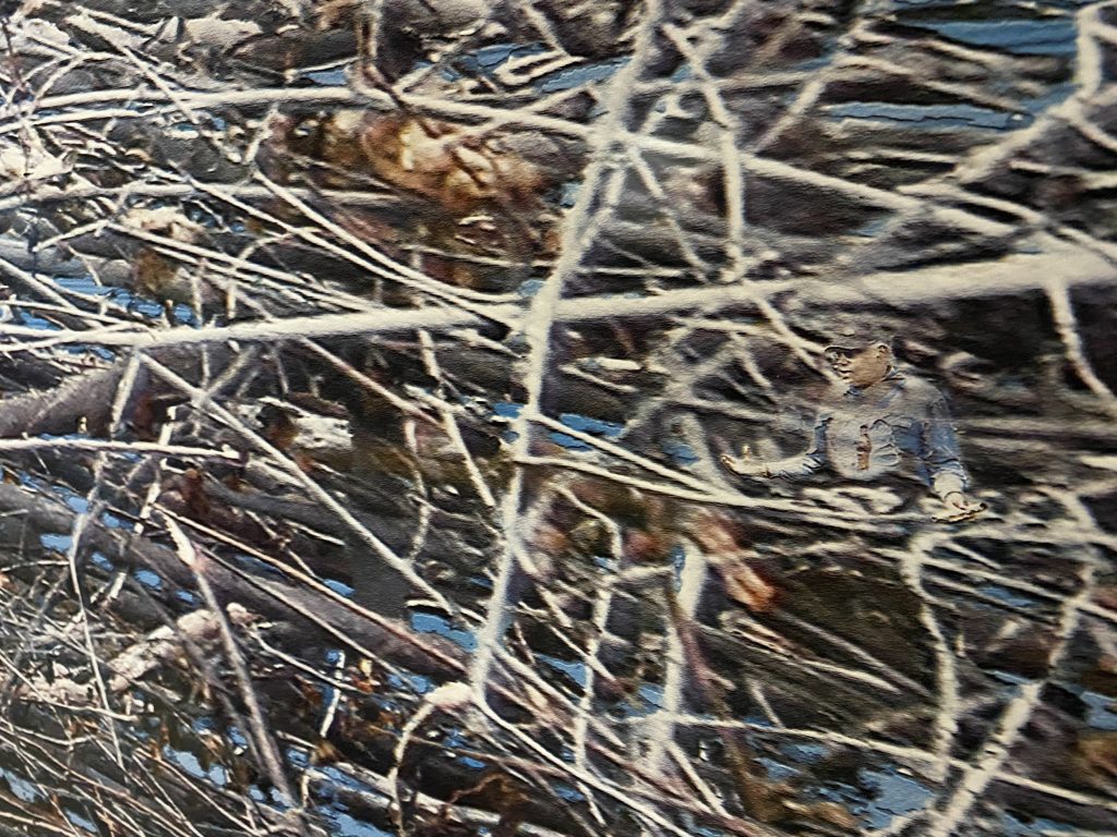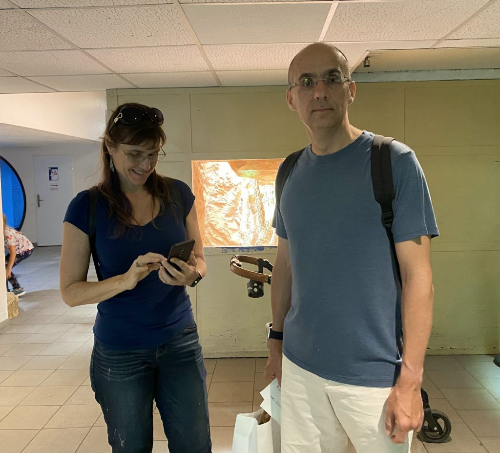 We found some really cool wall art, which looked like it was just a bunch of twigs. But when you zoom in a lot, you can see that they had placed tiny little people in between that you could search around and find. I think that was a subway station.