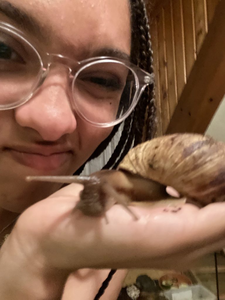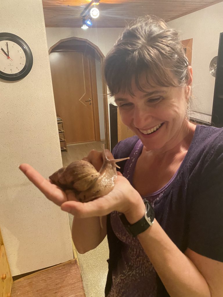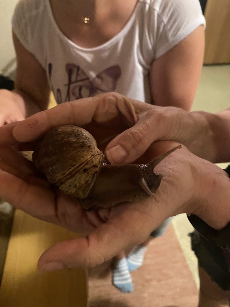 There was a girl staying upstairs who was working for the summer at a neighbouring farm. She had a couple of huge pet snails in a terrarium, and let us hold them!