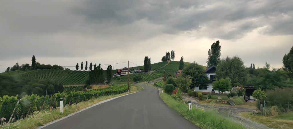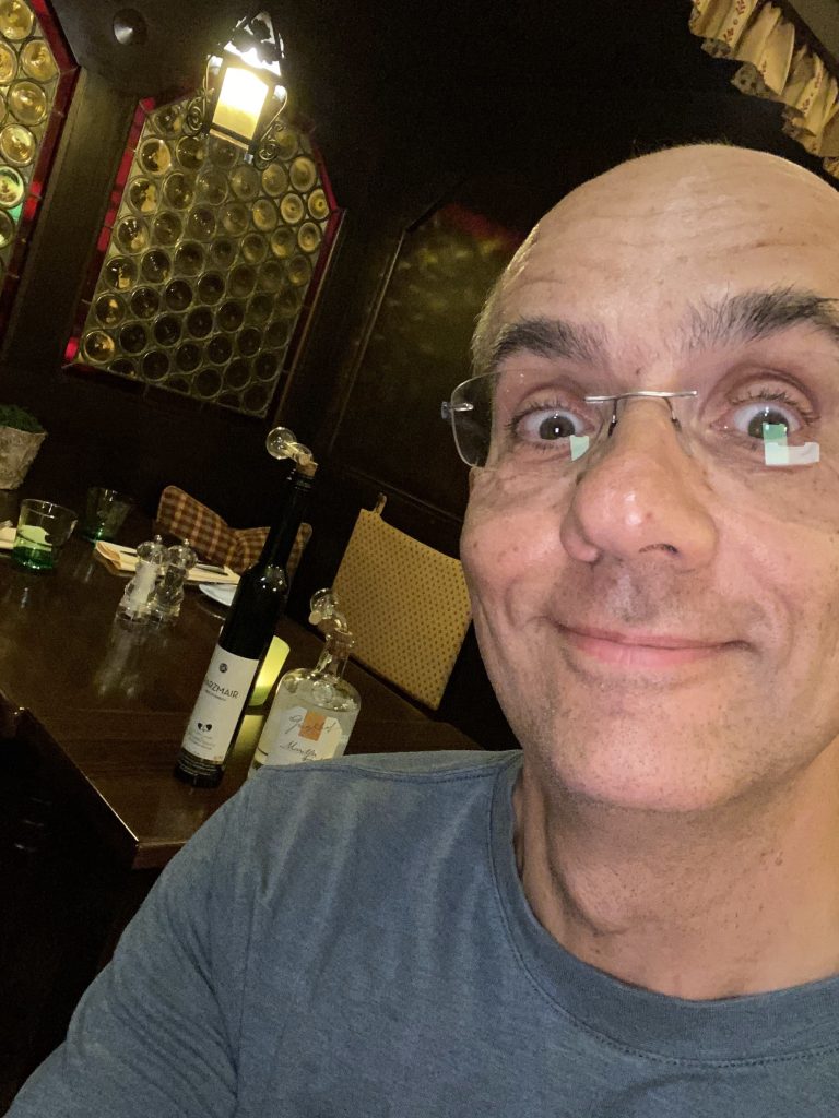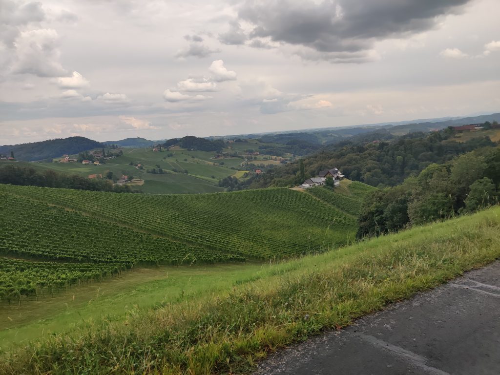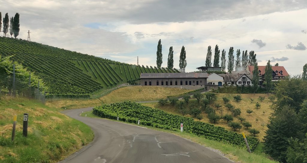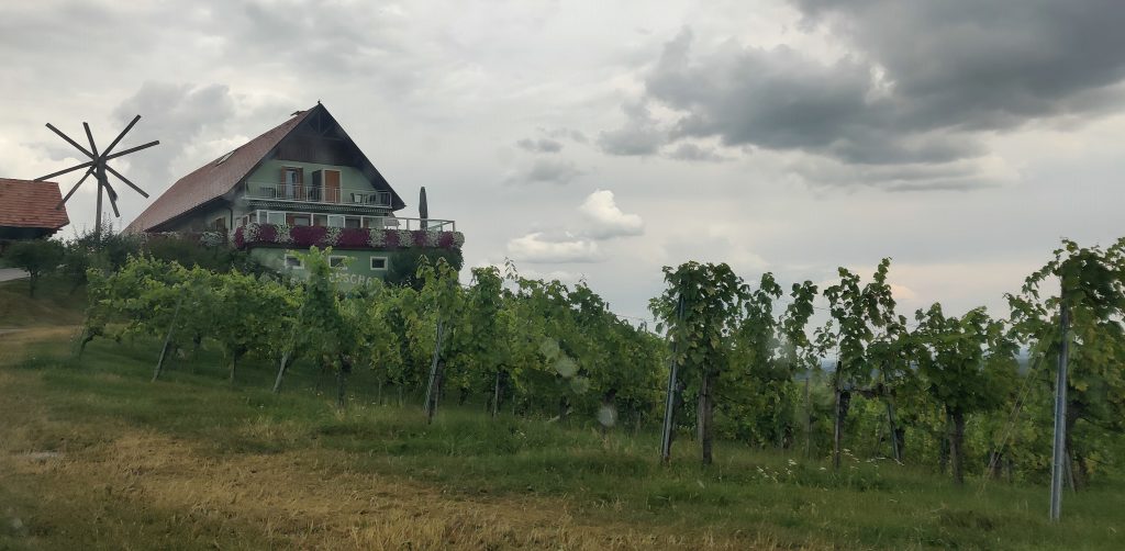 We drove along the winery street. Literally, all the wineries are along this one road. We found a really nice quaint bouchenshank. Many were very modernized, and all glass and tall metal pillars, but the one we found really had a nice vibe and terriffic view. It was raining but it didn’t matter because we had a table outside under the veranda. I had their Moscato white wine, and bread board with the pork fat spread and delicious dried house sausage. Lothar had a cheese and bread board. It was a real highlight!