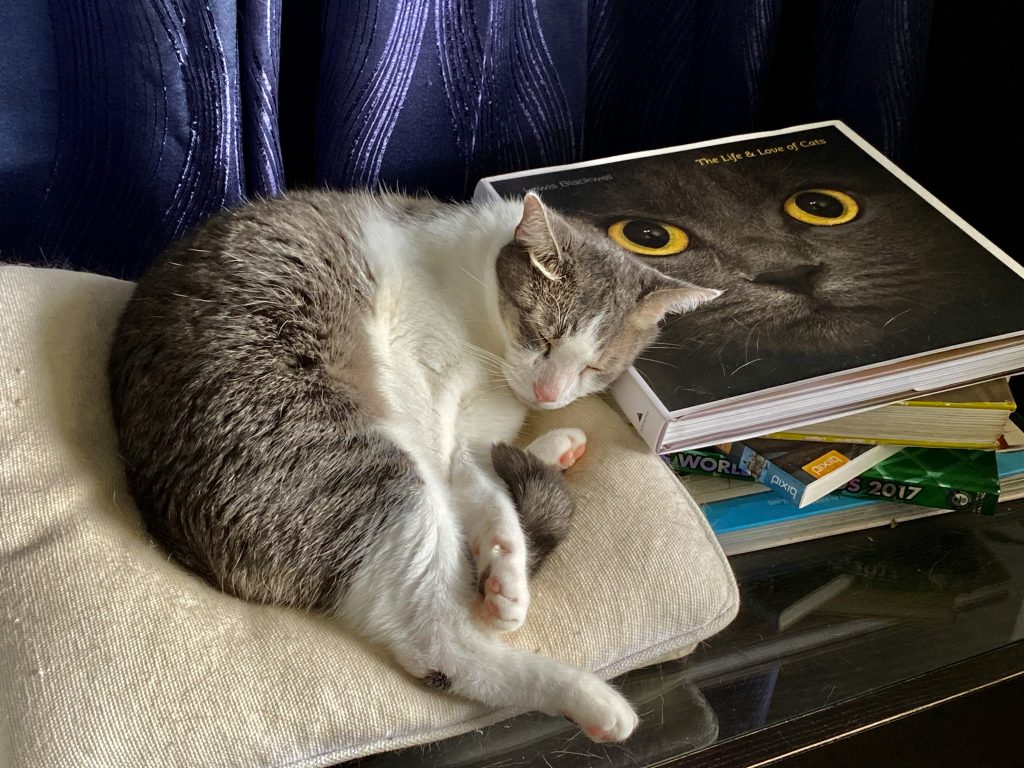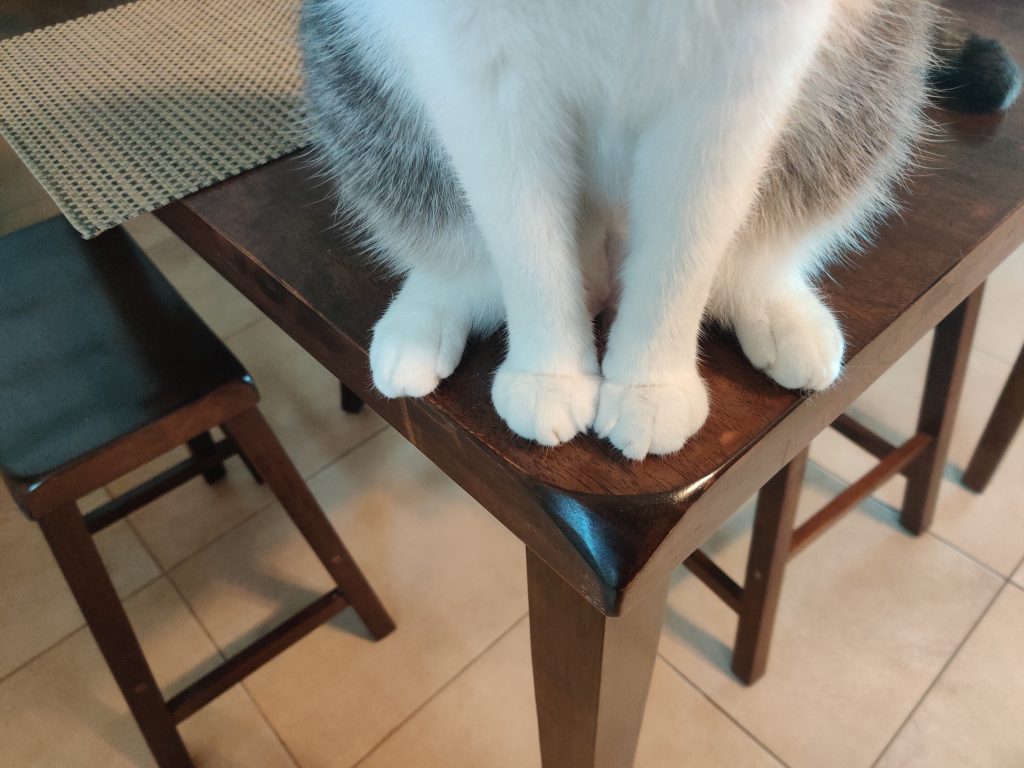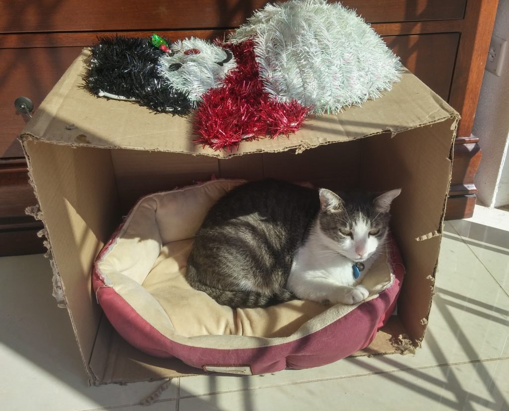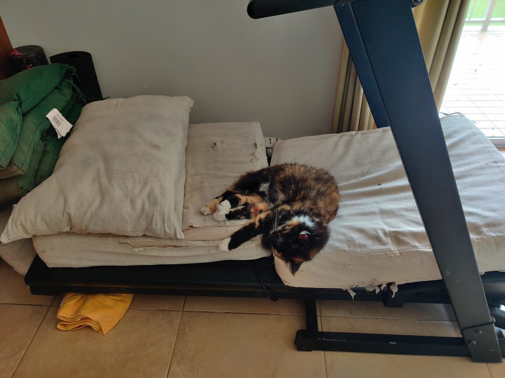 Then later in the month, Fiona came by as a Category 3 hurricane. We prepared for this one a lot more, and brought outdoor things inside. Princess found a spot on the mats from the balcony furniture.