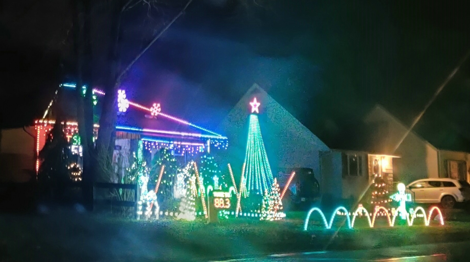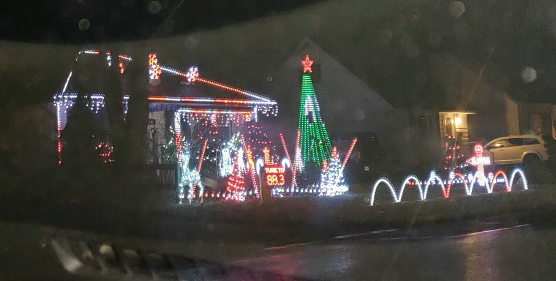 And finally, we went to a drive-through Christmas lights show that was coordinated with music and a whole little skit! All you do is drive up, tune into the radio station, then sit back and enjoy. Really well done! The pictures were taken through the windshield, but still ok. 🙂