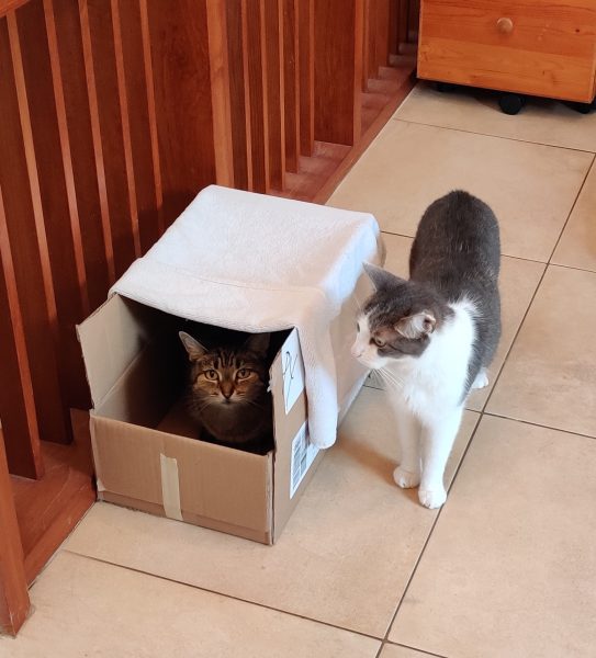 Lance with Nosey. Although not a fast friendship, Lance and Nosey got along nicely. Here’s a cute moment trying to see who can be the one in the box!